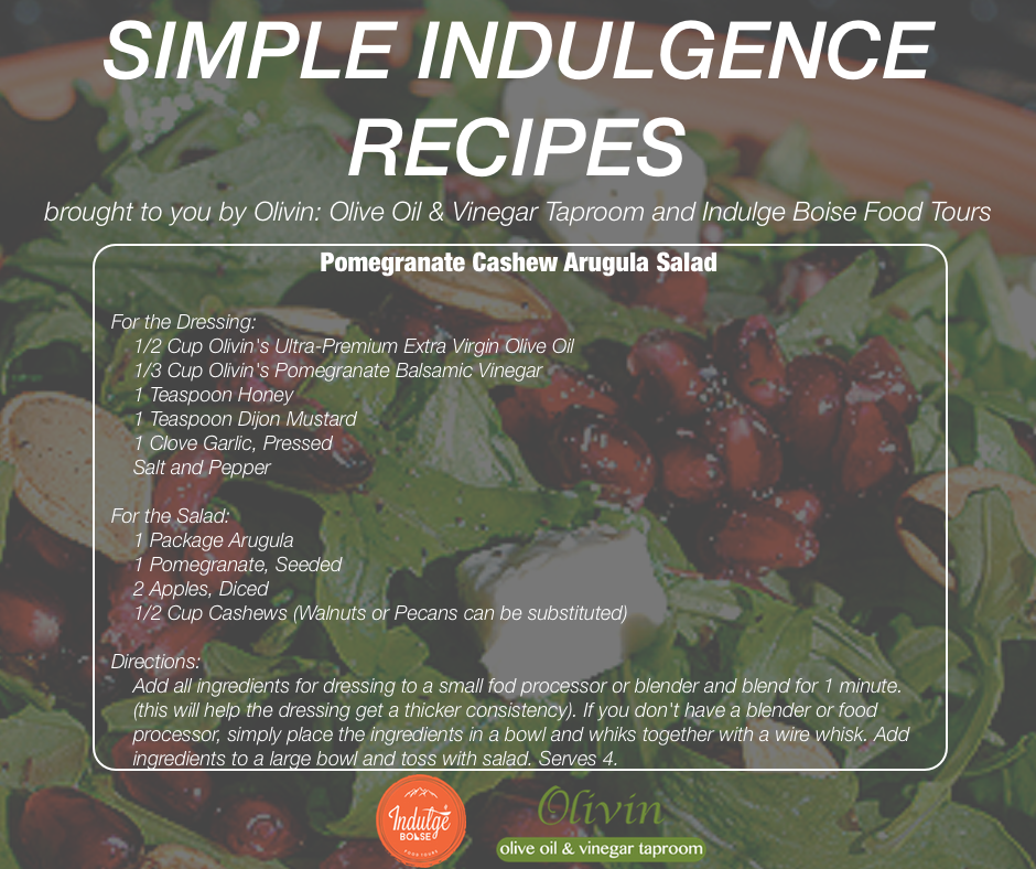 Indulge Boise is proud to partner with Olivin: Olive Oil & Vinegar Taproom to present simple, seasonal recipes for you to try at home. Check Simple Indulgence out on a regular basis to gather ideas on how to spice up some of your home-cooked meals. This Month, we share our Pomegranate Cashew Arugula Salad.